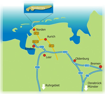 Die Anreise von weiter östlich geht am besten über Bremen und Oldenburg. Schneller geht es dann über die A28/ A31 via Emden, kürzer ist es über die B72.