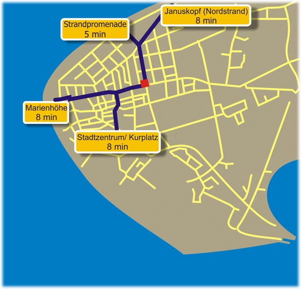 Die angegebenen Zeiten auf der Grafik rechts sind zu Fuß zu erreichen - mit dem Fahrrad ist man natürlich viel schneller. Generell ist ein Fahrrad durchaus zu empfehlen.